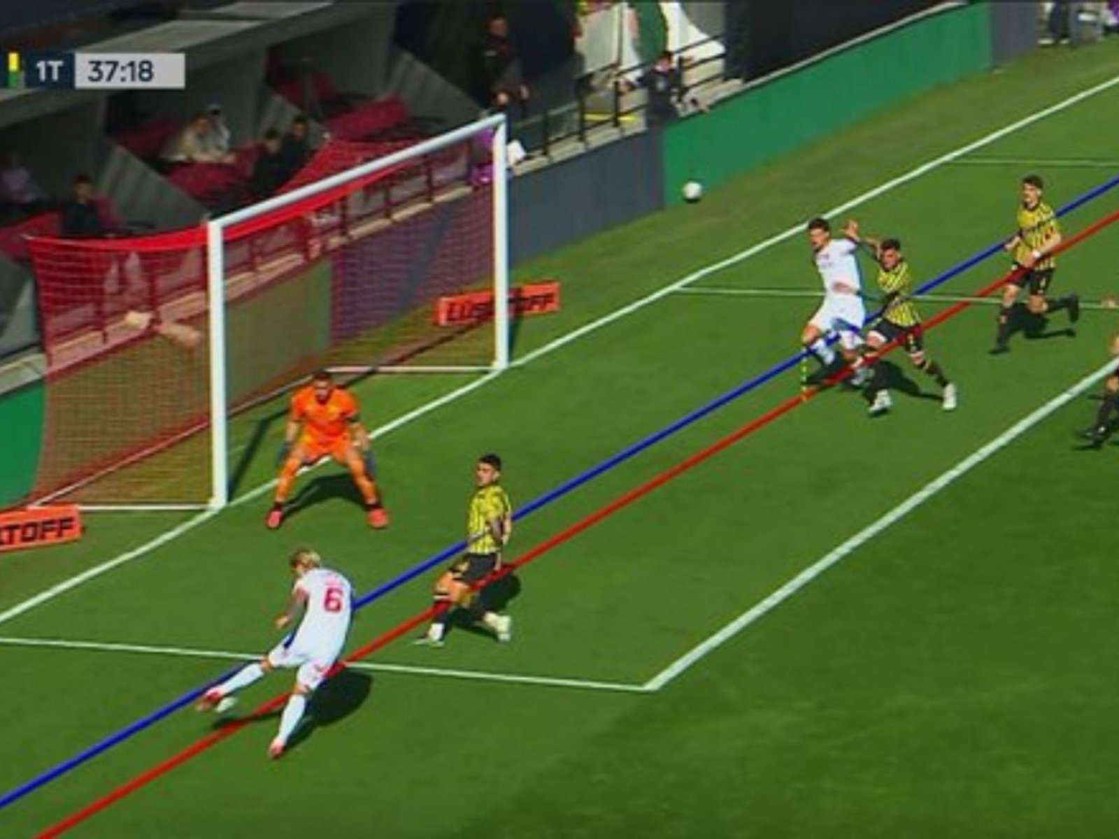Sin embargo, cuando un rato más tarde la TV mostró las líneas para justificar el cobro, las dudas no se despejaron. Como fue un pase atrás, la línea que habilita parte de la pelota (y no del último defensor), pero la misma está en el aire al ser impactada por Insua, y no se condice con la raya trazada por la tecnología. Así, no terminar de estar claro si Bruera estaba o no habilitado.