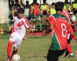 Thiago Cuba, la figura de Guaraní y del partido, encara la marca de Franco Maida, de muy buen trabajo en Brown (Foto prensa Liga Posadeña)