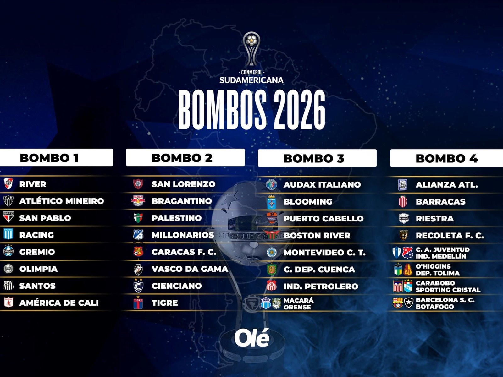 Con todos los clasificados, se definirán los bombos. Así, de acuerdo al ranking que la Conmebol publicó en diciembre, River (3° en dicho escalafón) y Racing (9°) ya saben que ocuparán el bombo 1 en el sorteo. San Lorenzo (37°) no podrá estar en ese lugar ya que América de Cali (36°) lo desplazó al ingresar a fase de grupos.