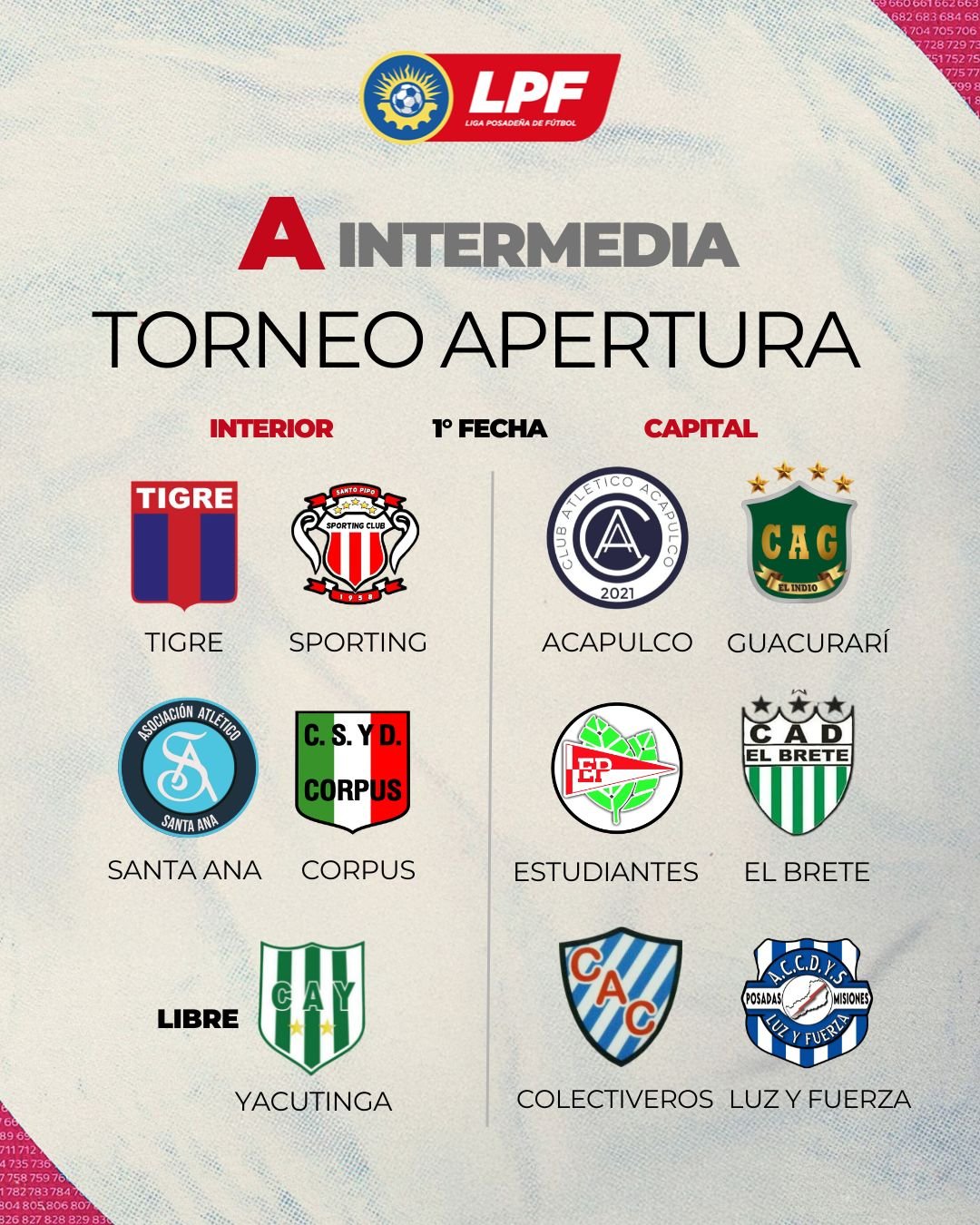 En la primera fecha de la Intermedia, en la “Zona A Interior” Tigre se medirá con Sporting y Santa Ana enfrentará a Deportivo Corpus; mientras que Yacutinga quedará libre. Por su parte, en la “Zona B Capital” se medirán Acapulco-Andrés Guacurarí, Estudiantes-El Brete y Colectiveros-Luz y Fuerza.