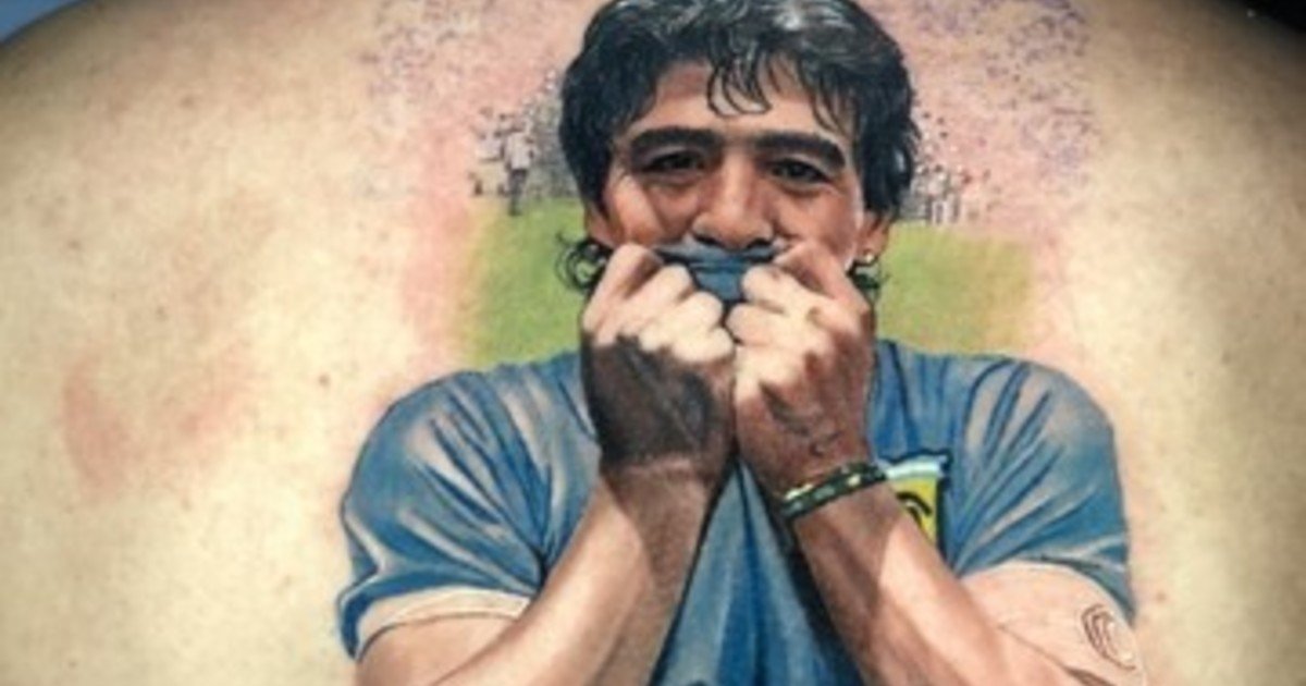Alan Velasco y el tremendo tatuaje que lleva de Maradona en la espalda.
