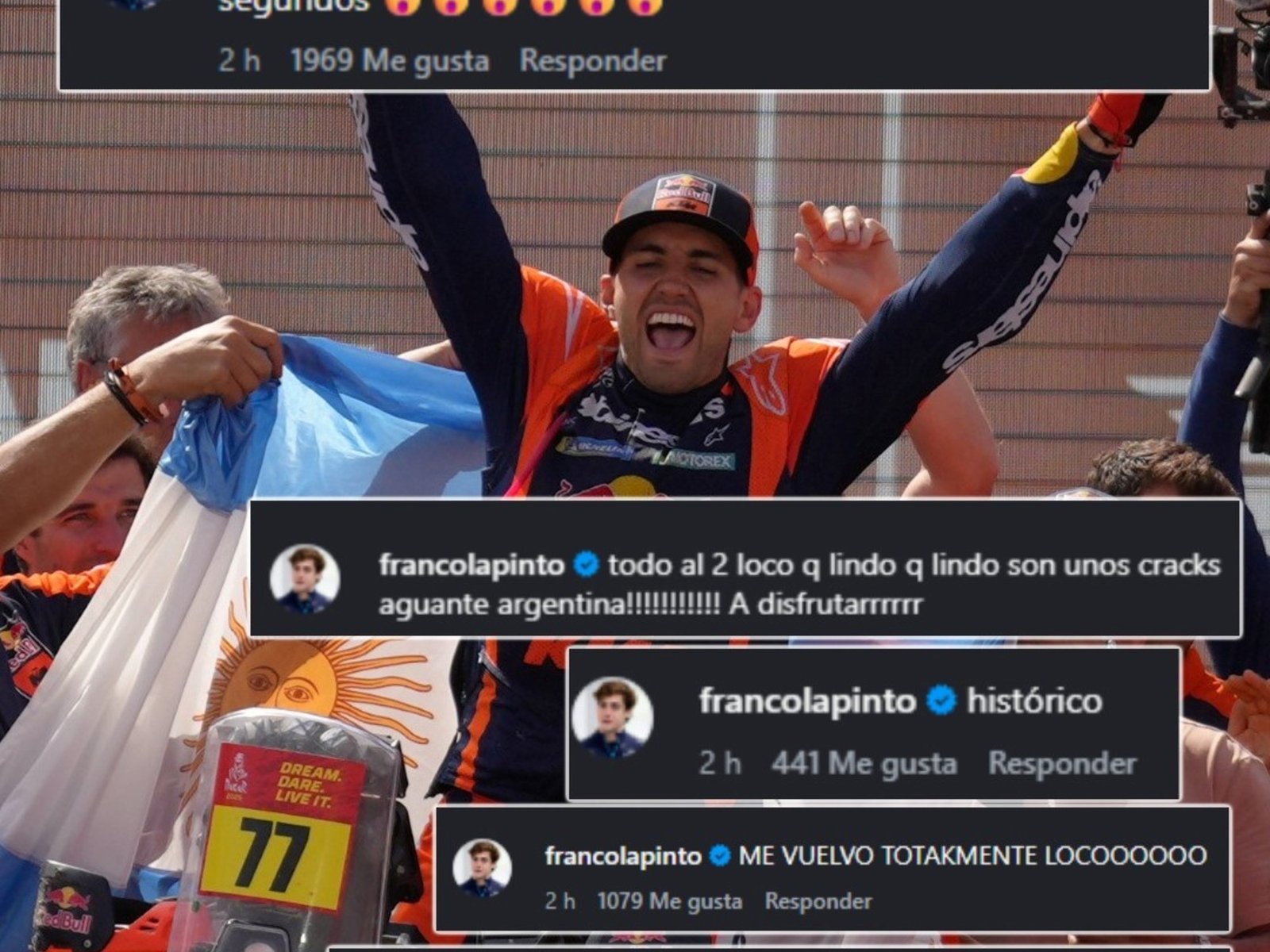Desde Inglaterra, donde se prepara con el equipo francés para la renovada temporada de F1, Colapa fue un hincha más. “VAMOS VAMOOOOOOO SOS UNA BESTIA 2 segundos”, fue lo primero que expresó. El comentario lo acompañó con emojis de incredulidad por la diferencia entre Benavides y el piloto Ricky Brabec, quien lideraba la competencia y quedó finalmente segundo. “ME VUELVO TOTAKMENTE LOCOOOOOOO”, agregó (sic) a continuación el pilarense, feliz por el logro del compatriota sobre dos ruedas. Lo calificó acertadamente como “histórico”.