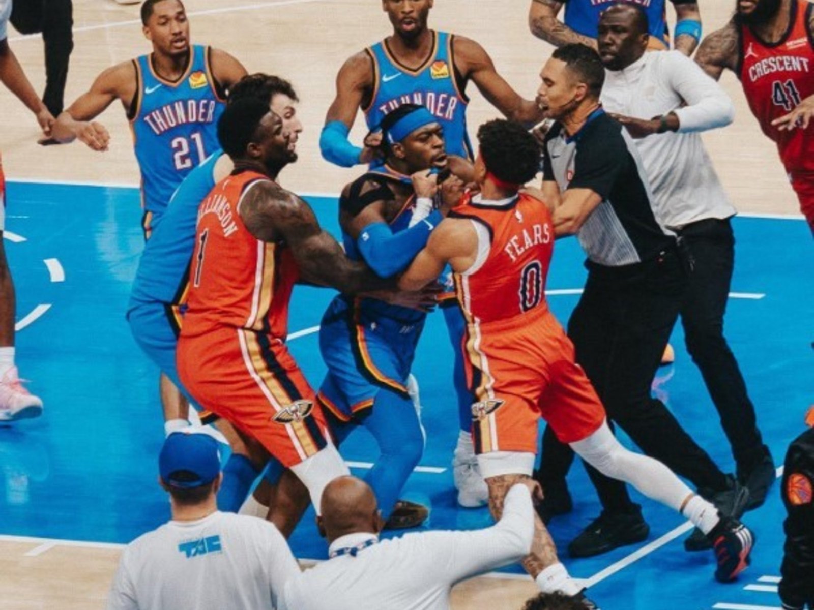 El primer cruce se dio a falta de 1′ 18” del final, cuando durante una reposición del costado, Jaylin Williams, ayuda base de Oklahoma, y Saddiq Bey, alero de New Orleans, se trenzaron y cruzaron fuerte luego de un forcejeo cuando aún la pelota no estaba en juego.