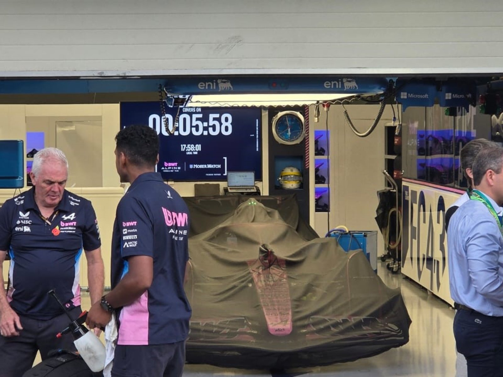 Olé llegó al box de la escudería francesa cuando faltaban pocos minutos para que comenzara el lapso de Parque Cerrado. El primer auto que se tapó con la lona negra fue el de Franco, y luego pasaron al de Pierre Gasly, ambos antes de que la cuenta regresiva llegara a cero en el contador de la pared del fondo del box.