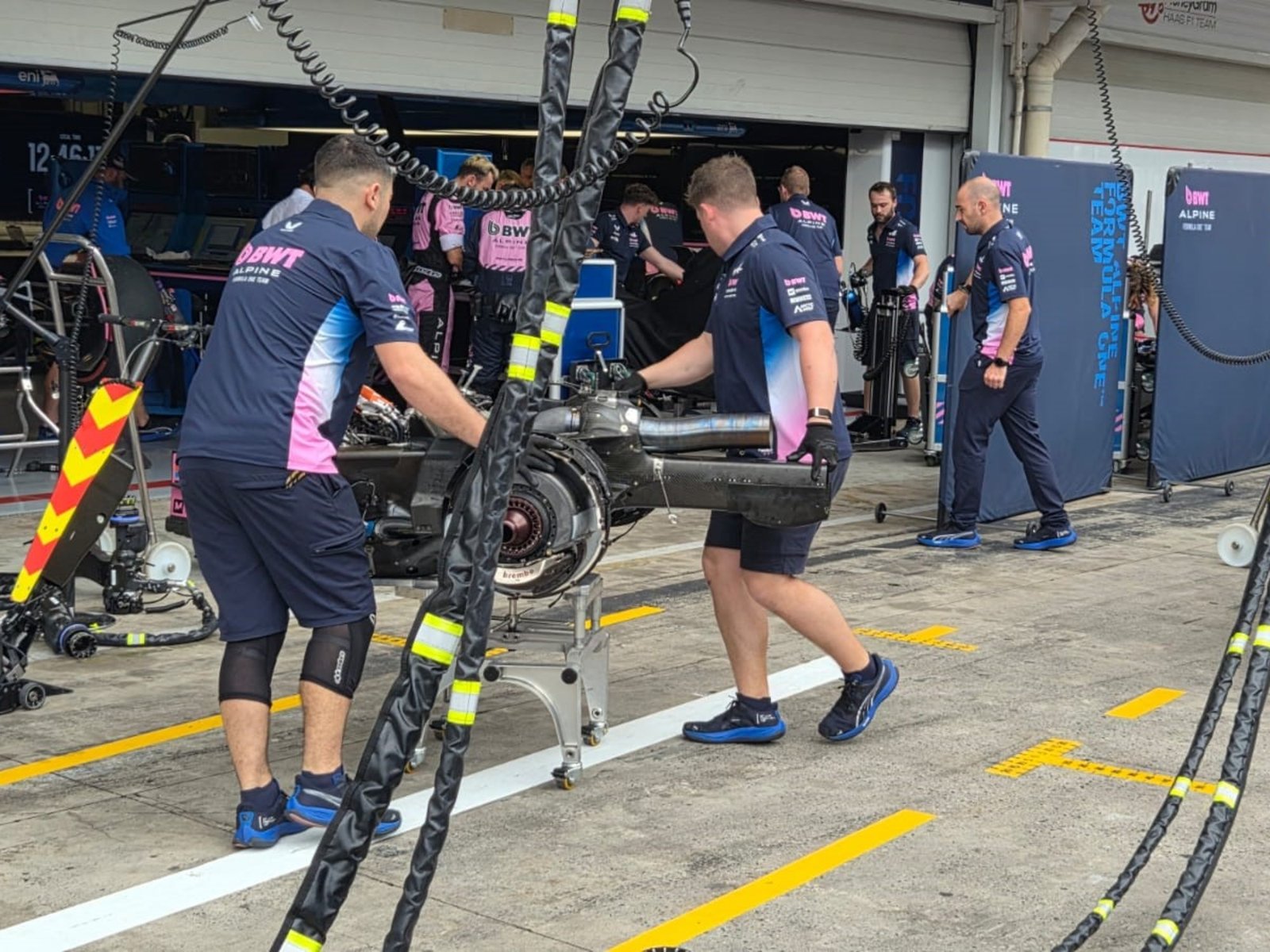 En el box del equipo está descubierta la parte de Pierre Gasly y tapada la de Colapinto, donde una decena de mecánicos está metiendo mano al monoplaza dañado. Sin embargo, algo se puede ver, sobre todo cuando, desde el sector de la derecha de la zona se abrió una puerta y empezaron a aparecer repuestos que iban y venían, según los golpes.