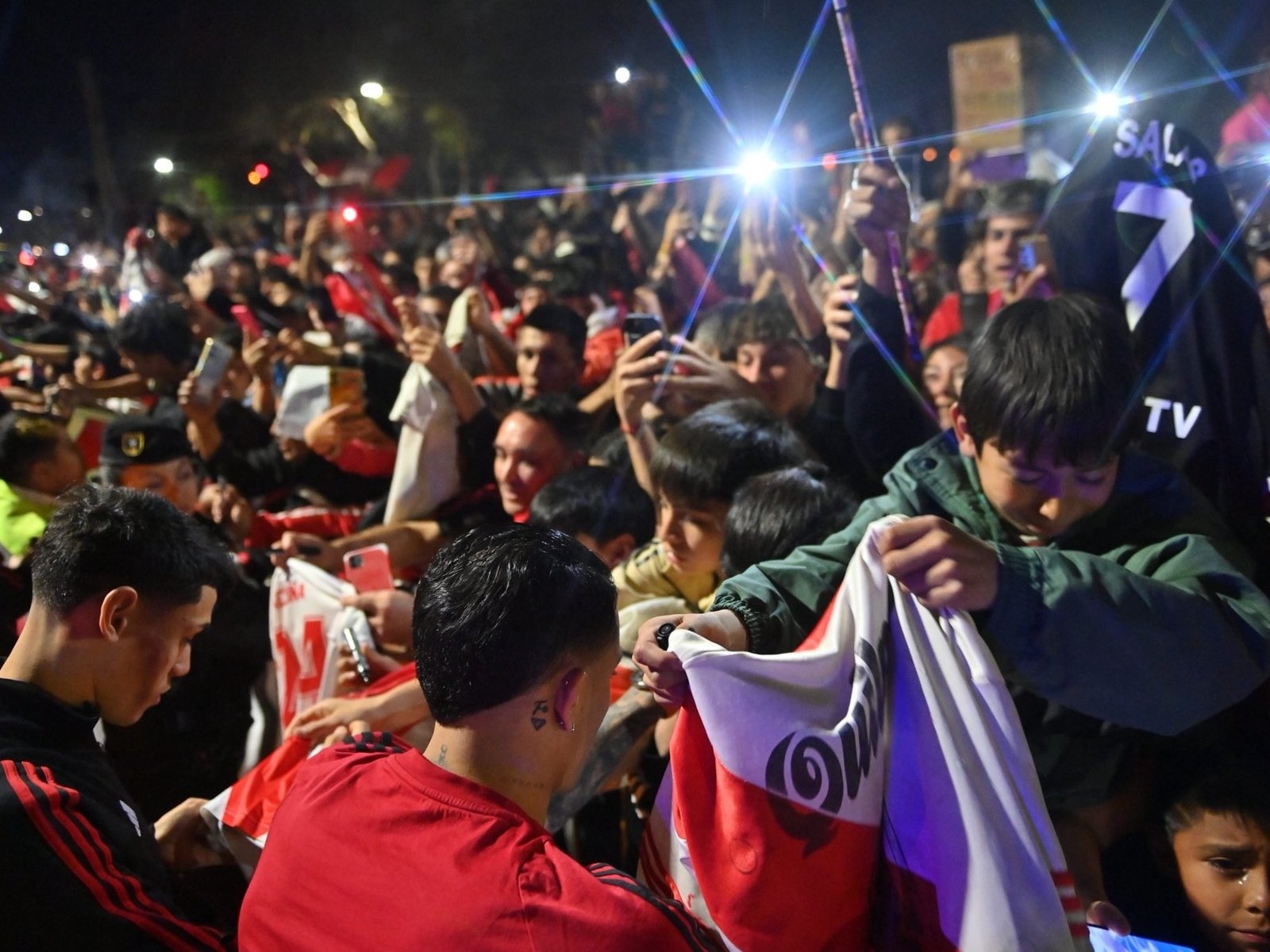 Ahí, el show empezó y continuó en el tiempo. Banderas, cotillón, fuegos artificiales, bengalas, cantitos... Los mendocinos le pusieron un color inigualable al recibimiento al plantel. Como era de esperar, Marcelo Gallardo fue el más aplaudido al bajar, aunque el crédito local no se quedó tan atrás: Enzo Pérez, una de las principales atracciones para los hinhas cuyanos, recibió una impactante ovación y sintió bien de cerca el cariño de su gente. De hecho, fue su papá y le acercó una bolsa de golosinas.